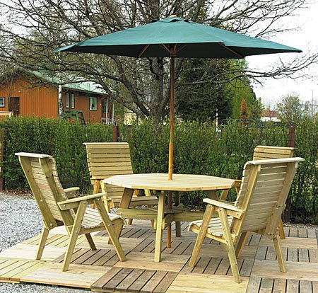 Tämä 8-kulmainen kalusteryhmä soveltuu muotonsa vuoksi hyvin pyöreille terasseille ja huvimajoihin, mutta voit sijoittaa sen myös tavalliseen tapaan pihanurmelle.