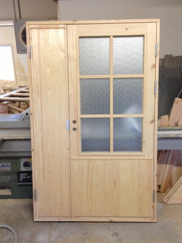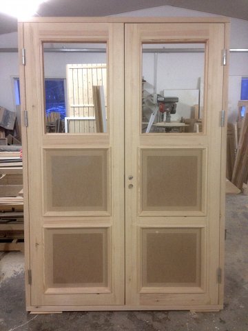 Ulko-ovi lämpölasilla. Materiaalina mänty.