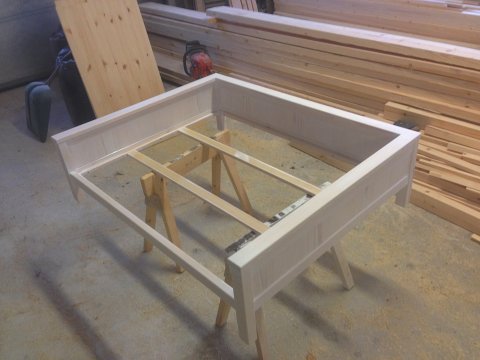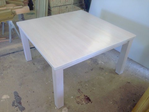 Massiivikoivupöytä asiakkaan mitoilla. Pintakäsittelynä Osmocolor-puuvaha, sävynä Lumi.