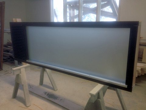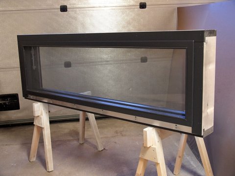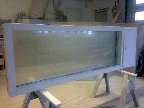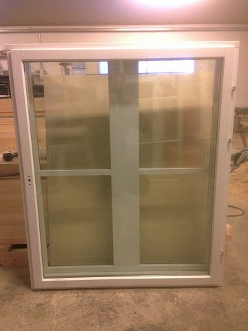 Pesuhuoneen ikkuna tuuletusluukulla. Etsattu lämpölasi.