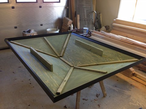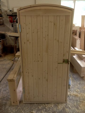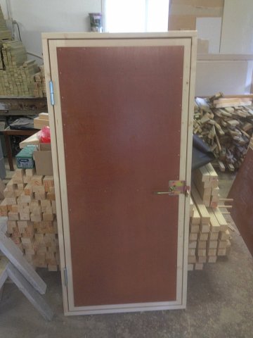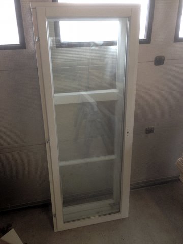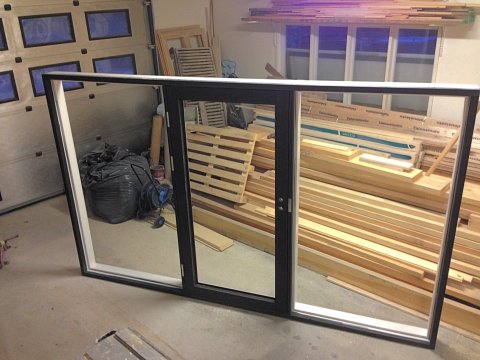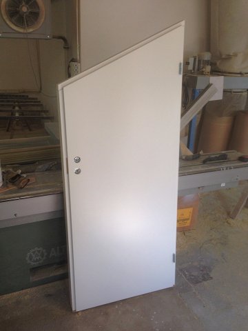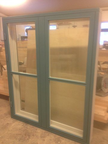 Mökin ulko-ovi ja kiinteät ikkunat samassa karmissa. Ulkopuoli kyllästetty musta ja sisäpuoli maalattu valkoinen.