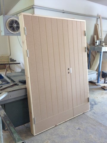 Asiakkaan mittojen mukaan tehty puuvalmis ulko-ovi avattavalla levikkeellä.