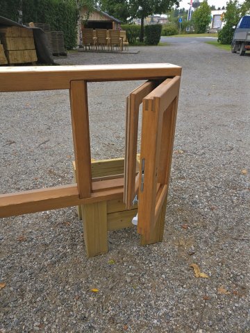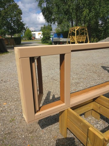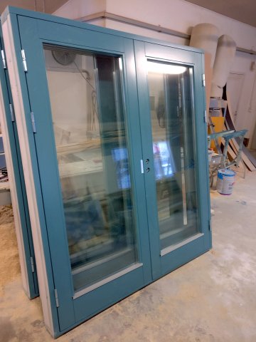 Mökin ulko-ovi ja kiinteät ikkunat samassa karmissa. Ulkopuoli kyllästetty musta ja sisäpuoli maalattu valkoinen.