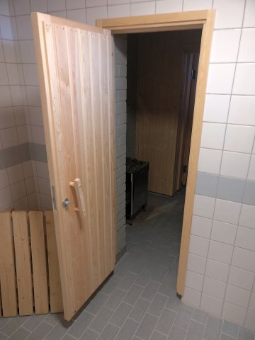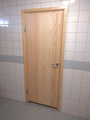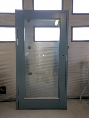 Ulko-ovi lämpölasilla. Materiaalina mänty.
