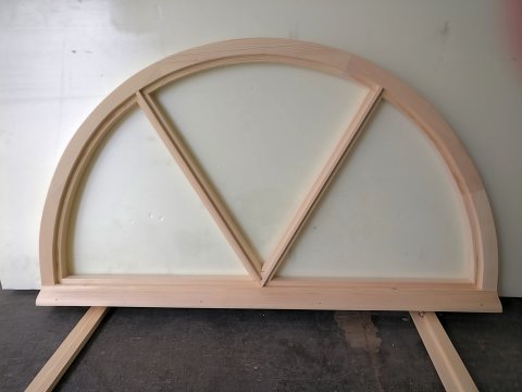 Sisäänaukeava mökki-ikkuna aidolla puuristikolla.